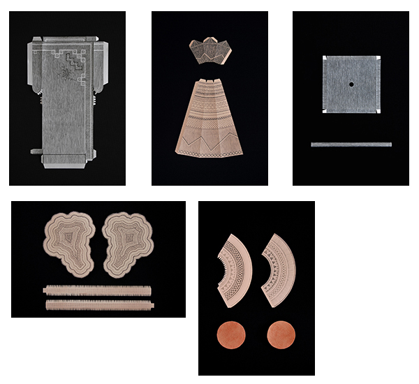 Mnemosyne - Über Objekte Muster ..... 2015 Serie, fortlaufend fotografische Dokumentation verschiedener Schnittmuster-Objekte (Bleistift und Buntstift auf Papier, cut-out, Lederimitat) >