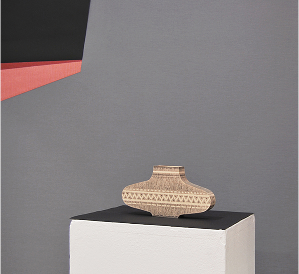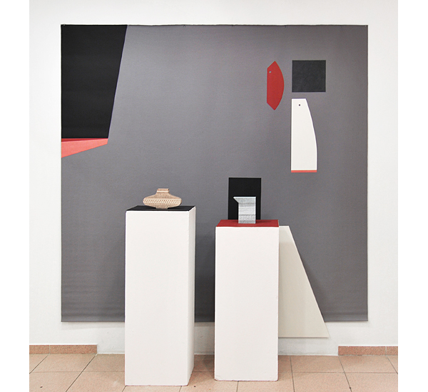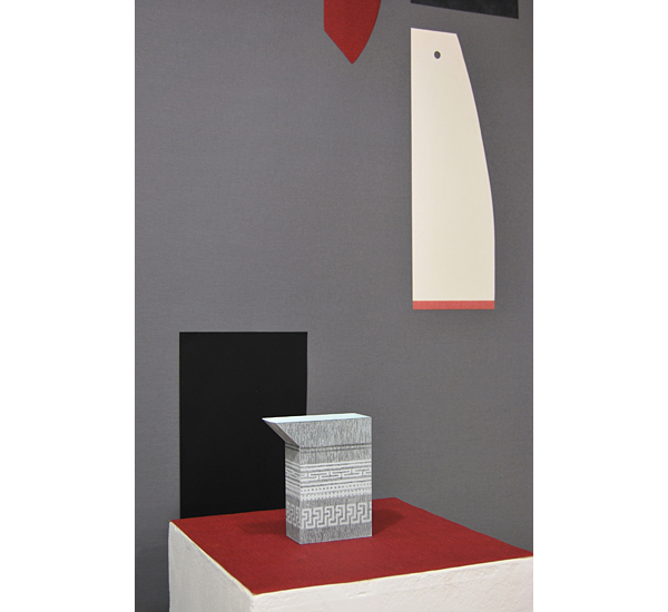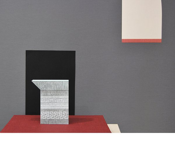 Mnemosyne - Über Objekte Arrangement I (Pattern) ..... 2013 Bleistift auf Papier, Karton, Papier, Lederimitat, Textilrollo, Holzsockel 217 x 200 x 54 cm >