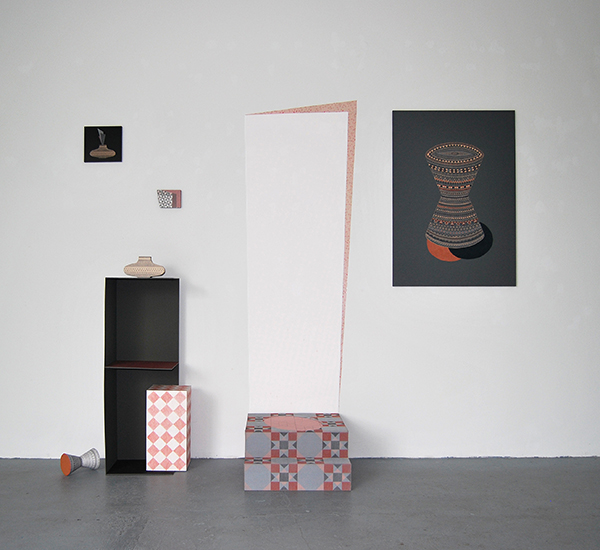 Mnemosyne - Über Objekte Arrangement III ..... 2013 Bleistift, Buntstift und Acryl auf Papier und Buchbinderleinen, Karton, Fotoabzug, Beamerlichtprojektion