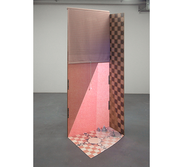 CABINE ..... 2014 Graphit und Buntstift auf Papier und MDF, Beamerlichtprojektion, Textilrollo, Fahrstuhltüre, Unterkonstruktion aus Holz 210 x 74 x 70 cm