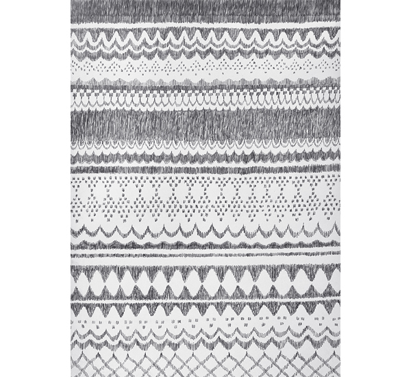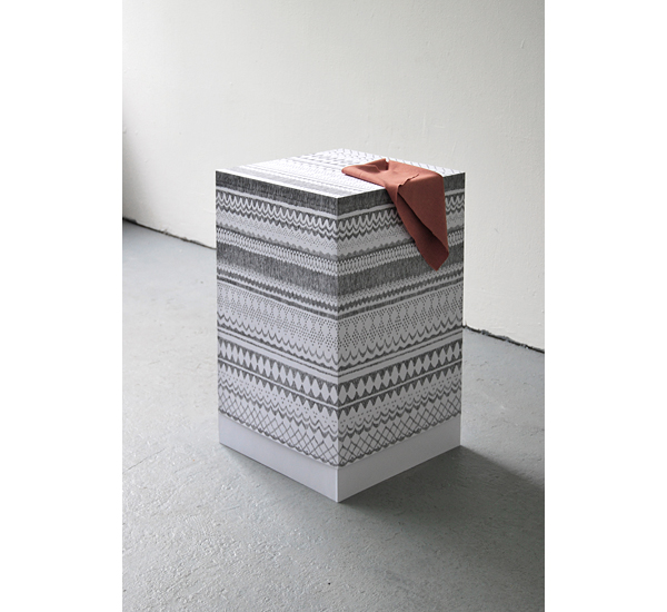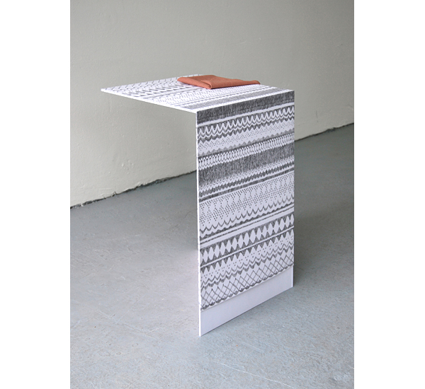 Die vorderseitige Erscheinung der Papierarbeit „Shawl“ zitiert die Mystik archaischer Formen und spielt mit der Rätselhaftigkeit, wie sie vielen Heiligtümern eigen ist. Hinter der illusionistischen Vorderseite, die einen Quader suggeriert, offenbart sich auf der Rückseite ein gerüstartiges Möbelstück-Fragment, das unwirkliches Licht aussendet.