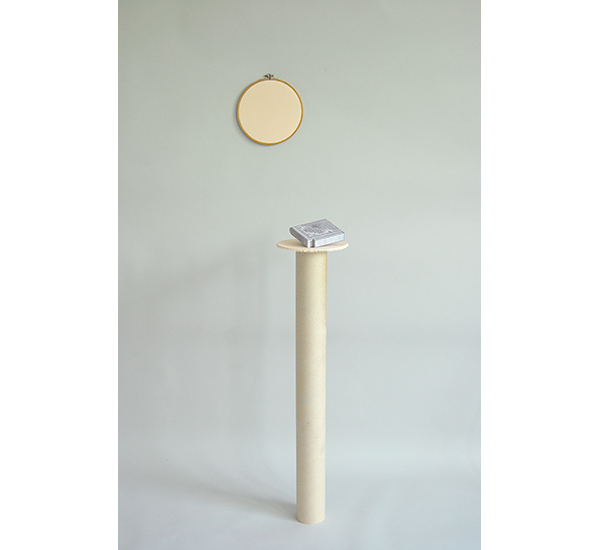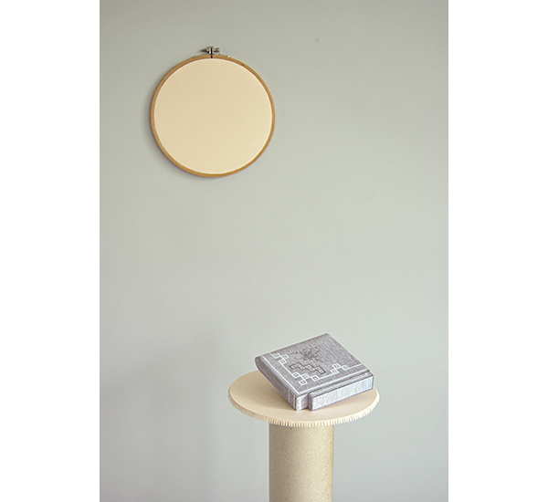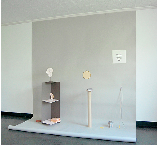 Mnemosyne - Über Objekte Arrangement V ..... 2015 Bleistift und Buntstsift auf Papier, Karton, Textil, Glasscherbe, Vorhangkurbel, Papierschnur, Stickrahmen 260 x 270 x 110 cm >