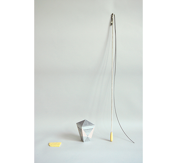 Mnemosyne - Über Objekte Arrangement V (Zähmung I) ..... 2015 Glasscherbe, Bleistift und Buntstsift auf Papier, Vorhangkurbel, Papierschnur