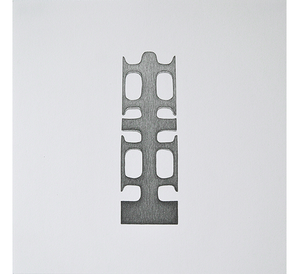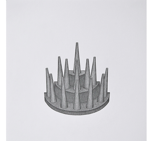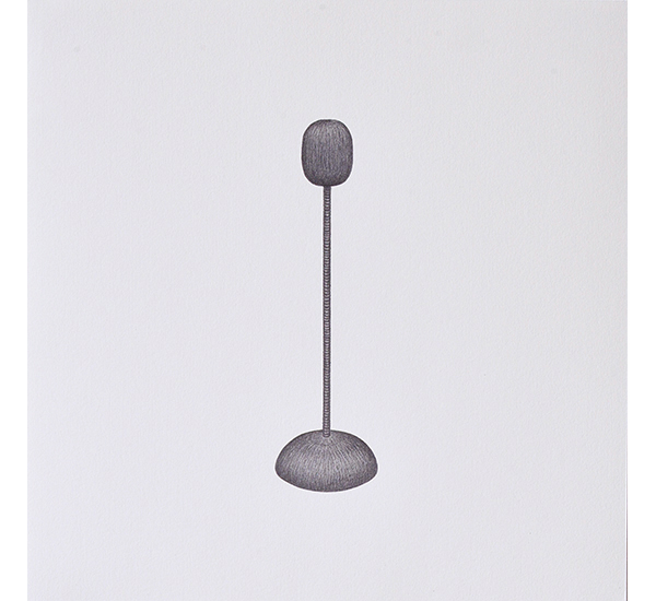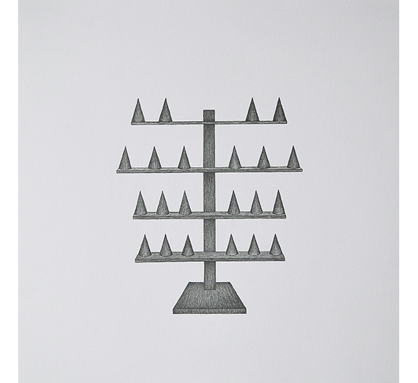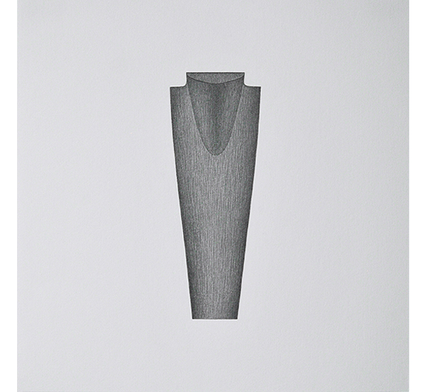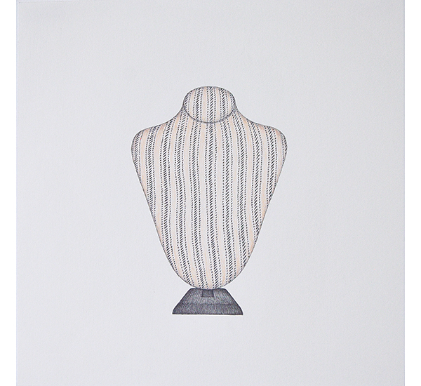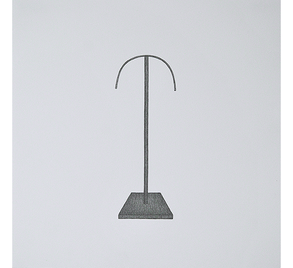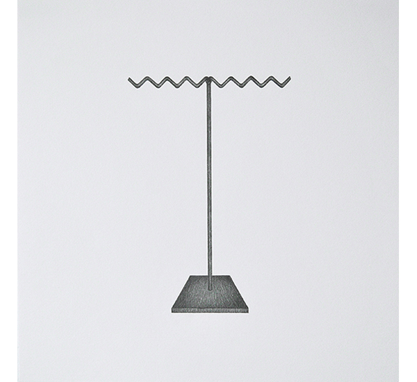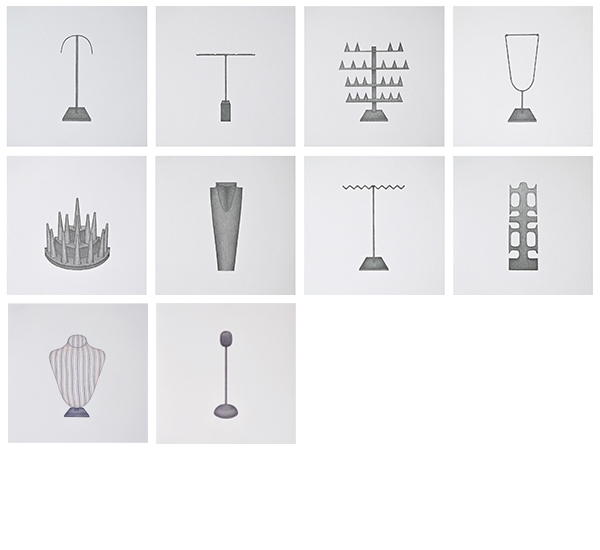 Die Serie entstand basierend auf Streifzügen durch Pariser Einkaufspassagen und zeigt unterschiedliche Schmuckständer, wie sie zur Präsentation ausgewählter Halsketten, (Ohr-)Ringe und Armreifen Verwendung finden. Durch das Fehlen des Präsentationsobjektes und das Herauslösen aus dem ursprünglichen Kontext, rücken die formalen Aspekte dieser Objekte, die üblicherweise hinter dem eigentlichen Präsentationsobjekt zurücktreten, in den Fokus. In ihrer Losgelöstheit erscheinen Sie fremd und vertraut zugleich. Sie erinnern dabei an Totem-Figuren archaischer Kulturen sowie an Modelle Moderner Skulpturen. Als Serie in Bleistift auf Papier entwickeln Sie Assotiationen zu unentschlüsselbaren Schriftzeichen.